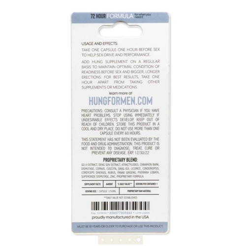 Take one capsule one hour before sex to help sex-drive and performance. For best results, take with 8 oz of water and one hour apart from other supplements or medications. Add hung daily supplement on a regular basis to maintain optimal conditions of readiness before sex and achieve bigger, longer erections.