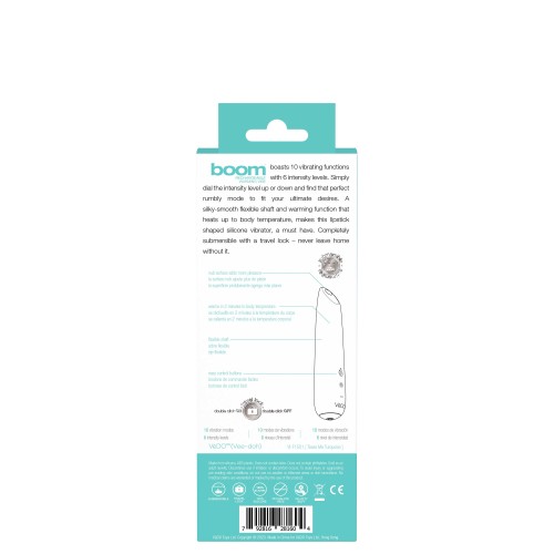 BOOM ultra-powerful vibrator boasts 10 vibrating functions with 6 intensity levels. Simply dial the intensity level up or down and find that perfect rumbly mode to fit your ultimate desires. A silky-smooth flexible shaft and warming function that heats up to body temperature, makes this lipstick shaped silicone vibrator, a must have. Completely submersible with a travel lock never leave home without it.