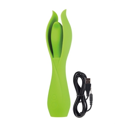 Silicone G massager. Intimately contoured for any woman. Full coverage petals for complete and total arousal. 10 intense functions of vibration pulsation and escalation. Rechargeable battery runs for 2 hours on high speed 3 hours on low speed. Complete charge in 2 hours. Unscented non-porous hypoallergenic. Virtually seamless satin finish Silicone. Auto on and off button with LED indicator light.