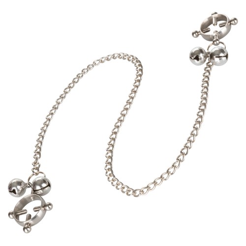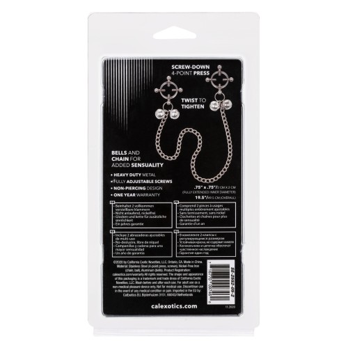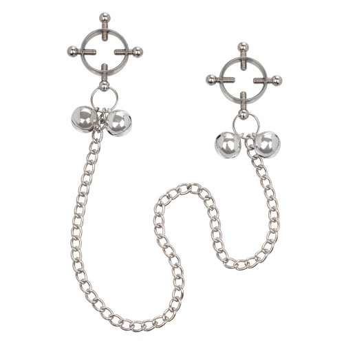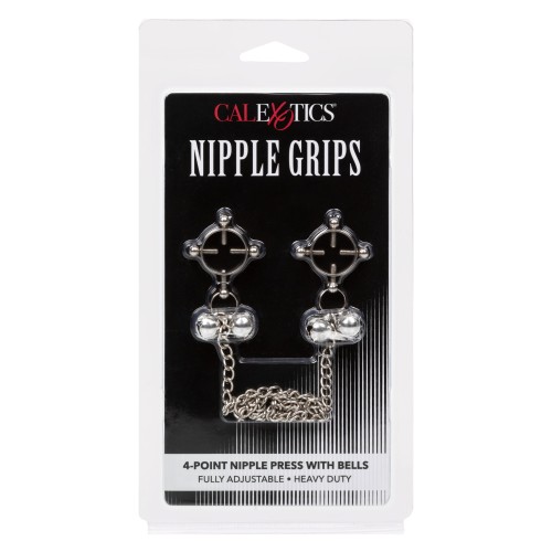 Add some fun to your sex life with the Nipple Grips 4-Point Nipple Press with Bells. Heighten your nipple play with a simple twist of the screws. Tighten the screws to exactly the pressure you desire, and pull on the chain for a satisfying tugging sensation with the bells ringing with pleasure.
