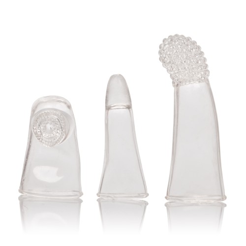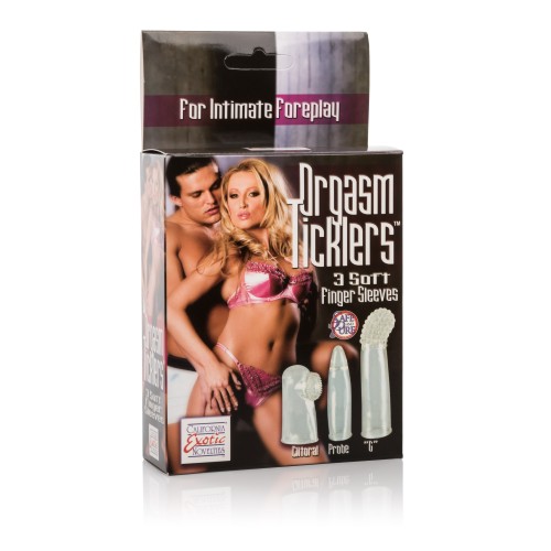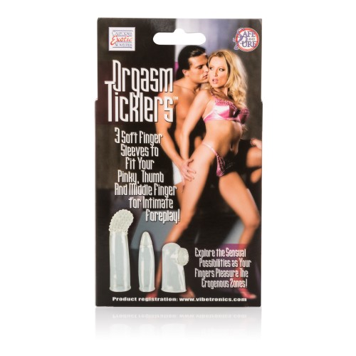 Elevate your intimate solo play with the versatile Orgasm Ticklers. The three, easy-to-use, finger sleeves are contoured for maximum satisfaction, and feature a nubby textured G-spot tip, a pointy probe and a sensuous, rounded clitoral teaser. The soft and supple Orgasm Ticklers are made from unscented TPR, and are discreetly sized for easy use. Choose your texture and apply sensuous rubbing, stroking, and teasing pressure for ultimate stimulation