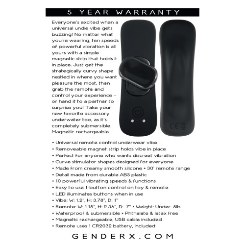 Everyone's excited when a universal undie vibe gets buzzing! No matter what you're what you're wearing, ten speeds of powerful vibration is all yours with a simple magnetic strip that holds it in place. Just get the srategically curvy shape nestled in where you want pleasure the most, then grab the remote and control your experience - or hand it to a partner to surprise you! Take your new favorite accessory underwater too, as it's completely submersible. Magnetic rechargeable.