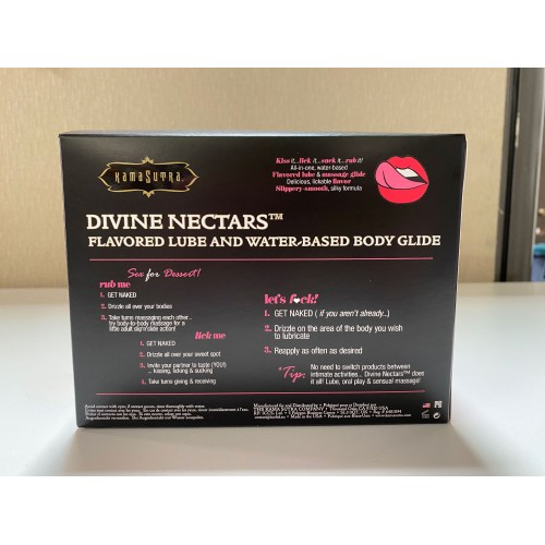 Kama Sutra's Divine Nectars is a water-based, flavored body glide. Use it anywhere on the body. Adds the perfect amount of slip and glide to any intimate activity with a spash of juicy, kissable flavor! Drizzle all over the body... anywhere you want to kiss or be kissed. Rub it, kiss it, lick it... the possibilities are endless.