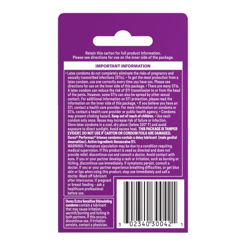 Durex Pleasure Pack assorted condoms put some adventure in your love life. Performax-Prolongs lovemaking with body heat activated climax control lubricant. Ultimate Feeling-Thin and ribbed for mutual pleasure. Intense Sensation-Extreme pleasure featuring hundreds of raised studs .