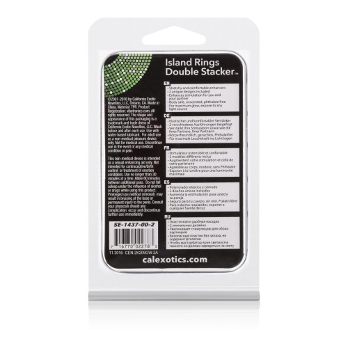 Enjoy twice the delicious pleasure with the Island Rings Double Stacker. The versatile, easy to use erection enhancer provides double support for increased stamina, peak performance and extended play. The super stretchy glow-in-the-dark rings are supplied in a pair and are designed for comfortable wear during prolonged intimate encounters. The stackers boast smooth contours and sensual stimulation beading, for maximized sensitivity and unlimited erotic satisfaction.