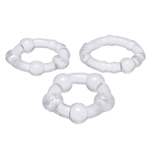 Show your partner how hard you can be and how long you can go with these Performance Penis Rings. Unlike most cock rings they are able to stretch out and fit just about any sized man for a more comfortable fit. Not to mention making it easier to put them on and to take them off. Each ring has a unique set of bumps for added stimulation while wearing. Each set includes three penis rings each a different size and pattern.