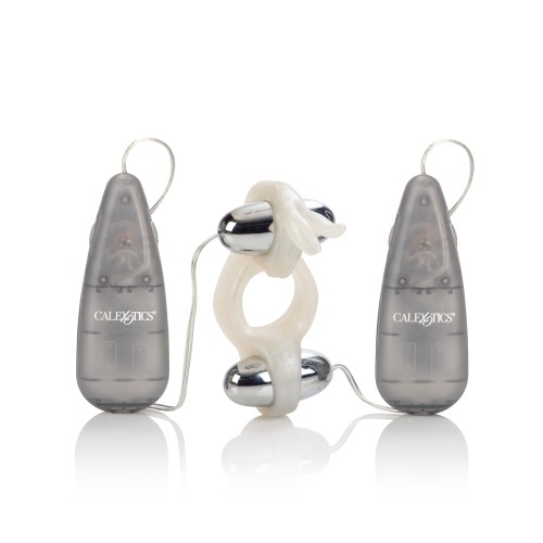 Sturdy erection enhancer with vibrating ears and tail Two multi-speed bullets dual controls for independent use PVC (enhancer) ABS with silver plating (bullets) 4 AA batteries