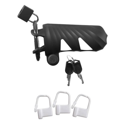 The silicone cage is easy to wash and super-hygienic. The vent holes allow you to clean your subjects package while they still wear the cage, and the ring is made from high-density plastic. The silicone sleeve has a small pee-hole to assist with urination, and the entire device can be worn under clothing for amazing one-of-a-kind thrills!