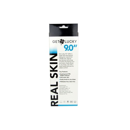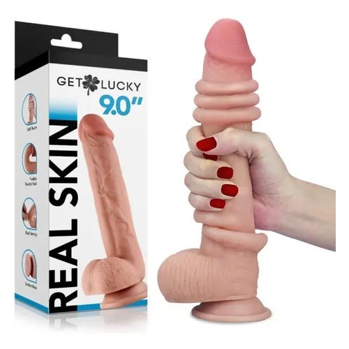 The 9.0" dildo is made with dual-layered sliding-skin material for a lifelike feel. Special dual density technology simulates the feeling of an erect penis. Easily bends to any shape. Use with a water-based lubricant for added comfort.