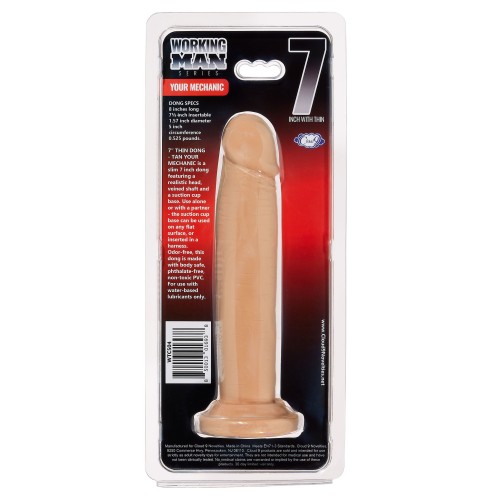 Your Mechanic is a slim 7" (17.78 cm) dong featuring a realistic head, veined shaft and a suction cup base. Use alone or with a partner, the suction cup base can be used on any flat surface, or inserted in a harness. Odor free, this dong is made with body safe, phthalate-free, non-toxic PVC. For use with water based lubricants only. Do not use Silicone Based Personal Lubricant.