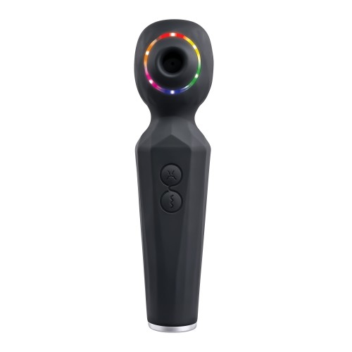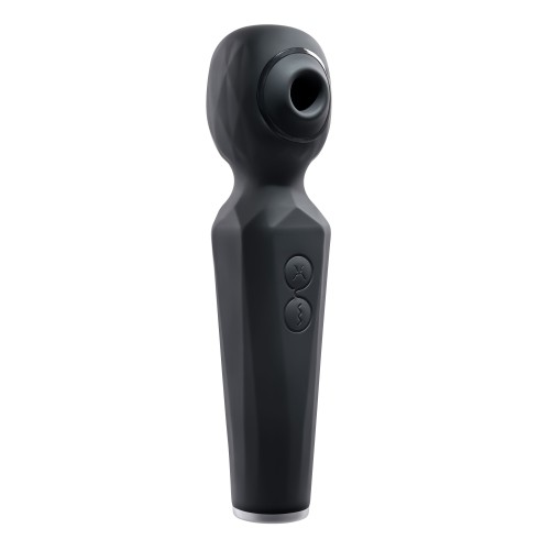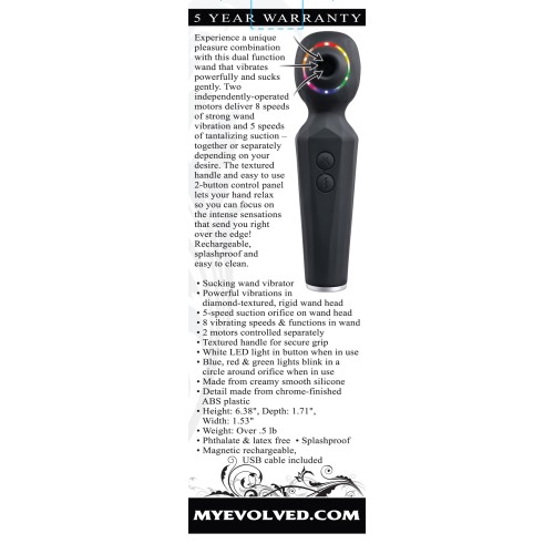 Experience a unique pleasure combination with this dual function wand that vibrates powerfully and sucks gently. Two independently-operated motors deliver 8 speeds of strong wand vibration and 5 speeds of tantalizing suction together or separately depending on your desire. The textured handle and easy to use 2-button control panel lets your hand relax so you can focus on the intense sensations that send you right over the edge! Rechargeable, splashproof and easy to clean.