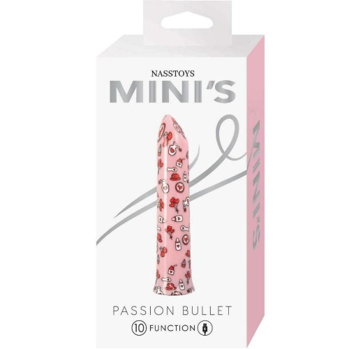 Fall head over heels for the Nasstoys Minis Passion Bullet, a charming little vibe thats big on playful pleasure. With its sweet pink design covered in balloon hearts, hats, vases, and more, this lipstick-shaped bullet feels like a love letter to your body. It delivers 10 powerful vibration functions in a compact, travel-friendly form, making it perfect for solo fun or as an upgrade to any toy that takes a bullet, like harnesses or dildos with a bullet pocket. Made from body-safe ABS and silicone, the Passion Bullet features a slanted tip for precise, angled stimulation and is splash-proof for easy cleaning. Its USB rechargeable, quiet enough for discreet use, and compatible with all types of lubricant to make every touch feel even better. Just remember to give it a full charge before your first play to get the most from the battery. After each use, clean it with toy cleaner or mild antibacterial soap. Whether youre in the mood for a quickie or a long, luxurious session, this pretty little bullet is ready to spark some passion.