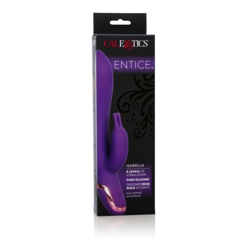 The essence of elegance - this silky soft silicone massager with powerful dual motors and luxurious designer accents is both beautiful and stimulating. Entice Isabella features 8 functions of intense vibration, pulsation, and escalation as it flexes and moves, bringing you to climax. With easy push button controls and auto-off, its superior design makes this intimate massager a favorite.