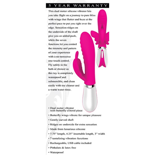 This dual motor silicone vibrator lets you take flight on a journey to pure bliss with wings that flutter and buzz at the perfect pace to put you right over the edge. Sensation ridges on the underside of the shaft give you an added push, while the seven functions let you control the intensity and pattern of your experience with a no-nonsense one-touch control. Fly safely in the bath or shower as this toy is completely waterproof and submersible, and clean easily with toy cleaner and a warm water rinse.