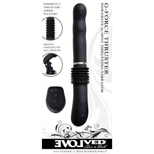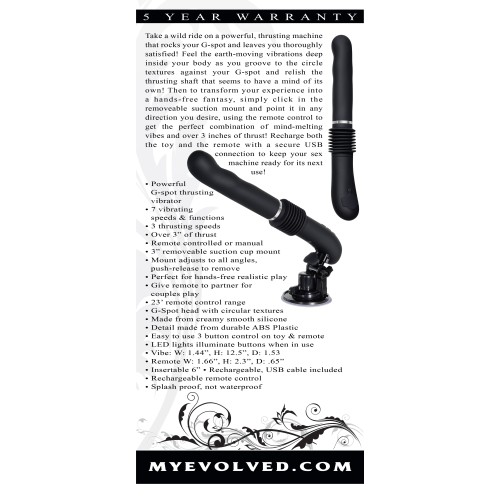Take a wild ride on a powerful, thrusting machine that rocks your G-spot and leaves you thoroughly satisfied! Feel the earth-moving vibrations deep inside your body as you groove to the circle textures against your G-spot and relish the thrusting shaft that seems to have a mind of its own! Then to transform your experience into a hands-free fantasy, simply click in the removeable suction mount and point it in any direction you desire, using the remote control to get the perfect combination of mind-melting vibes and over 3 inches of thrust! Recharge both the toy and the remote with a secure USB connection to keep your sex machine ready for its next use!