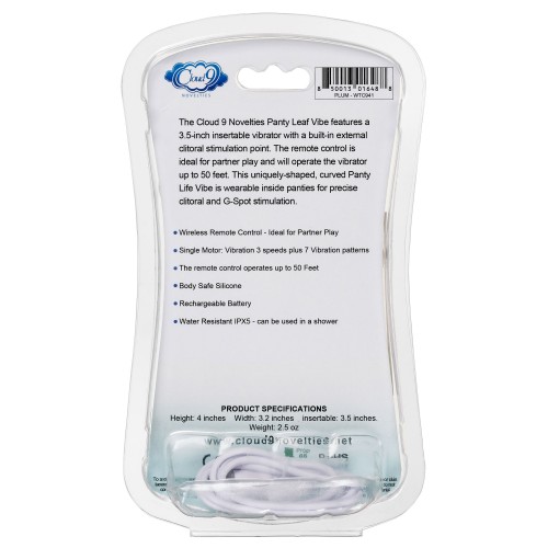 The Cloud 9 Novelties Panty Leaf Vibe features a 3.5 inches insertable vibrator with a built in external clitoral stimulation point. The remote control is ideal for partner play and will operate the vibrator up to 50 feet. This uniquely shaped, curved Panty Vibe is wearable inside panties for precise clitoral and G-Spot stimulation.