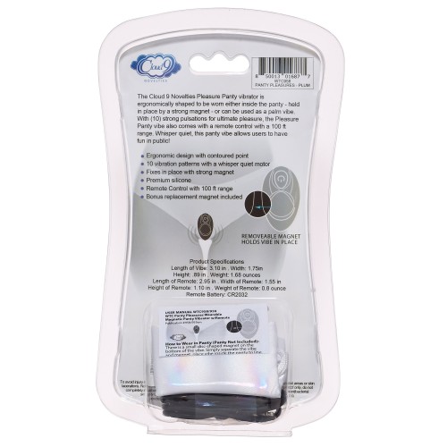 The Cloud 9 Novelties Pleasure Panty vibrator is ergonomically shaped to be worn either inside the panty, held in place by a strong magnet or can be used as a palm vibe. With 10 strong pulsations for ultimate pleasure, the Pleasure Panty vibe also comes with a remote control with a 100 feet range. Whisper quiet, this panty vibe allows users to have fun in public! Features: ergonomic design with contoured point. 10 vibration patterns with a whisper quiet motor. Fixes in place with strong magnet. Made using body safe, phthalate free Premium Silicone. Bonus silk storage pouch included.