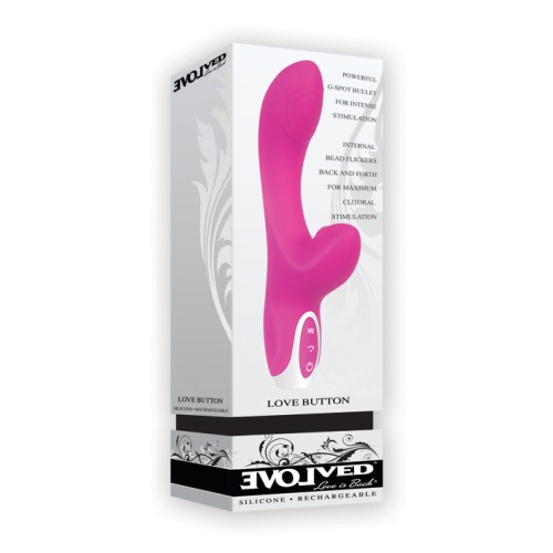 This silky smooth, sensual massager indulges your love button with a unique clitoral bead nestled under a sheath of luxurious silicone. With a separate motor and multiple speeds, the bead flicks up and down like a tongue, building your orgasm deep and strong, mimicking the best oral pleasure youve ever experienced! A G-spot shaped shaft completes the erotic journey, which you can also enjoy in the shower or bath since the Love Button is completely submersible. Clean up is easy with toy cleaner and a warm water rinse.
