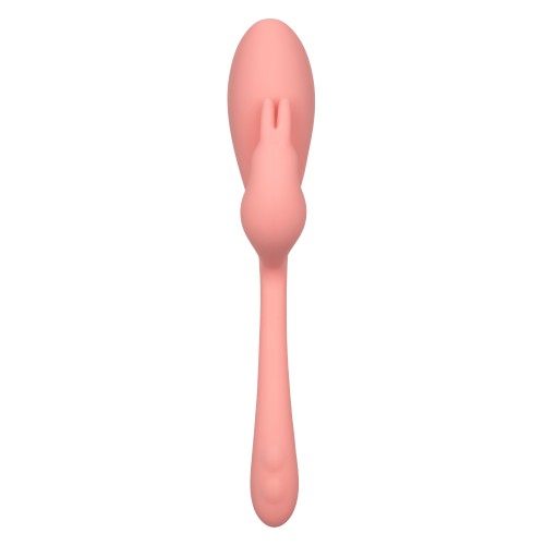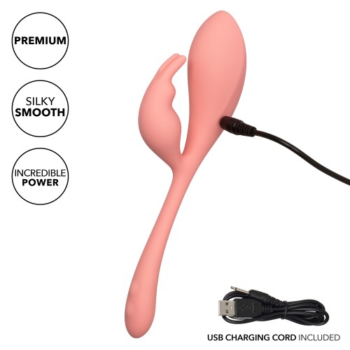 Indulge in waves of pleasure as the Elle Liquid Silicone Bunny moves you in all the right ways. The intimately contoured vibe is as thrilling as it is versatile with an extremely flexible body, flicking rabbit teaser, and 10 indulgent vibration functions. From steamy solo showers to hot times in the hot tub, get playful with the waterproof surface and powerful functions of vibration. The easy-touch 2-button control lets you cycle through the knee- shaking settings. While the easy touch buttons control the intensity and the vibe gives you the stimulation you want, the pliable body holds any position you desire. Recharge the premium silicone teaser in 2.5 hours with the provided USB charging cable to enjoy 35 minutes of high-speed stimulation or 90 minutes of low speed vibrations. The premium liquid Silicone is body safe, unscented and phthalate free that is softer, smoother, and more durable than traditional silicone.