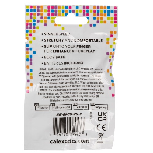 Bring back the art of foreplay with the teasing Vibrating Finger Teaser. The marvelous mini teaser easily slides powerful vibrations onto any fingertip with the soft stretchy teaser ring. Slip the soft and stretchy finger teaser onto your finger and delight yourself or your lover with the gently ribbed surface and shuttering bullet vibrator. These travel-ready teasers are the perfect toys to bring on any vacation or a thrilling way to spice things up in the bedroom.