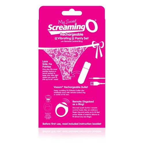 Rechargeable vibrating panty set with remote control ring. Lace side-tie panties in a one size fits most size features a secret pocket to keep your vibe right where you want it! (Fits up to 60" waist). Vooom rechargeable bullet with 10 functions that wirelessly sync with remote-control ring or works on its own. The remote is disguised as a ring! Discreet push-button remote looks like an ordinary finger ring and works up to 50 feet away! Made of stretchy silicone to fit almost any size finger.