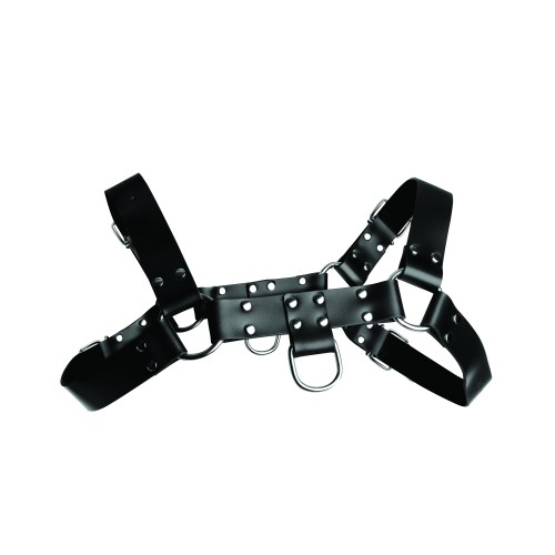 Place your partner into this chest harness and enjoy new ways you can enjoy bondage play. The harness features multiple adjustment points and includes a D-ring in the front and back. Attach various bondage items to these D-rings to take bondage play to the next level.