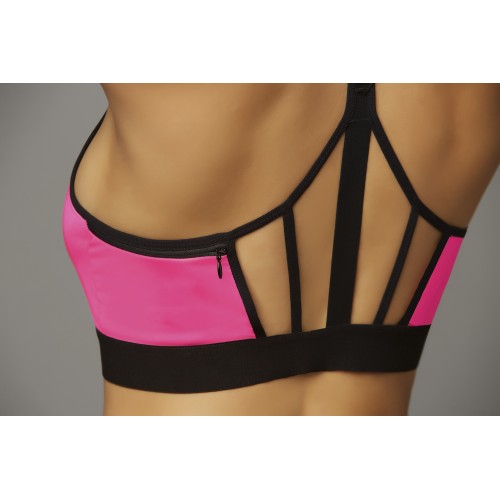 Microfiber and elastic sports bra with zipper front, cage back details, Poly-bag packaging.