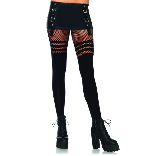 Seamless opaque faux thigh high pantyhose with striped fishnet thigh accent. One size fits most 90-160 lbs. Hanger packaging.