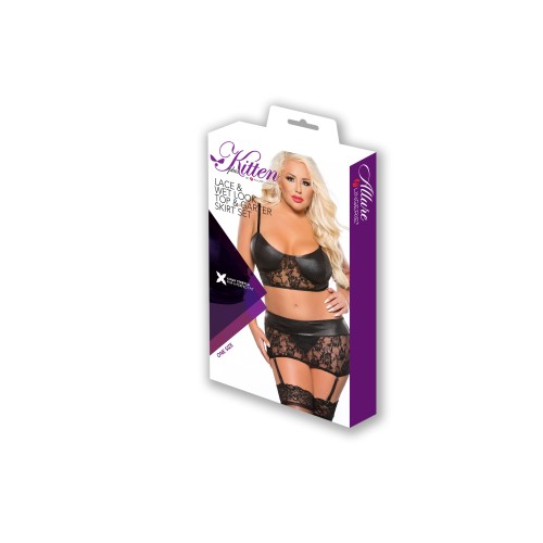 Kitten Plus Lace & Wet Look Top & Garter Skirt Set - One Size Plus Size