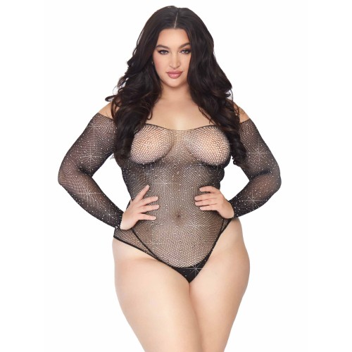 All eyes will be on you in this Rhinestone fishnet Bodysuit by Leg Avenue. A versatile and sexy plus size lingerie piece, this one-piece must have features all over rhinestone detail on the long sleeved, Snap Crotch lingerie Bodysuit. Perfect for layering as part of a festival outfit, under a blazer, or surprise your boo with a sexy night in.