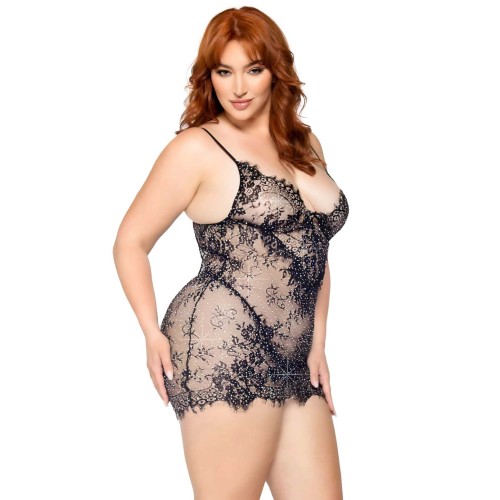 All eyes will be on you in this 2 piece eyelash lace lingerie dress by Leg Avenue. The stunning plus size lingerie set features shimmery rhinestones on delicate black lace fabric for an unforgettably sexy look and paired with flirty thong panties, this plus lingerie dress is sure to be a bedroom favorite.