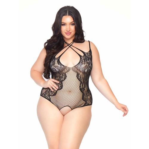 Net Lace Crotchless Teddy with Multi Strap Wrap Around Halter and Faux Lace Up Back, wrap yourself up in this sexy plus size lingerie Crotchless Teddy by Leg Avenue, featuring net panels, Multi Strap Wrap Around Halter, spaghettis straps, and faux lace up back. Sexy and versatile, the lace design of this hot lingerie look enhances your curves and makes a statement in the bedroom or as an cute lingerie layering piece for night out looks. (Panty not included)