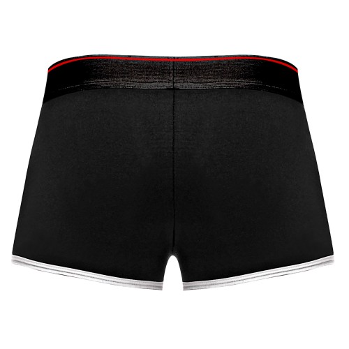 From the Retro Sport collection by Male Power, this style includes: A panel short with color blocked fabric inserts, high cut legs accented with white trim and stripes, and a plush elastic waist band with MP logo.