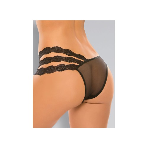 Asymmetrical sheer panty with blossoming triple lace side bands.