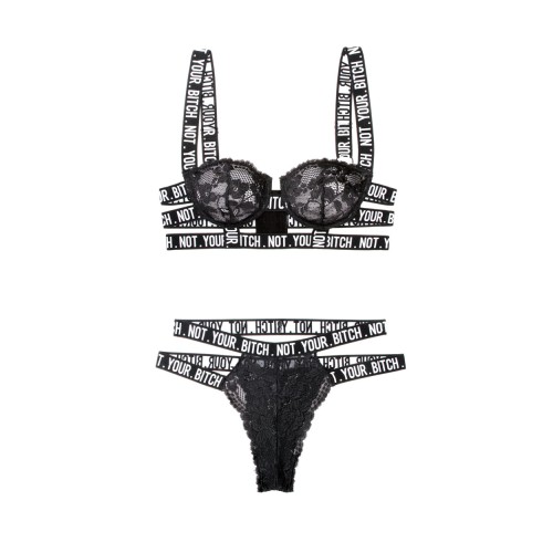 Lace caged bra with "Not Your Bitch" adjustable elastic straps and matching cutout panty.