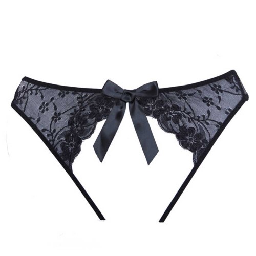 The panty with a flirtatious attitude. Fully open back panty topped with a satin bow and scalloped lace around the hips. Crotchless and mesh front.