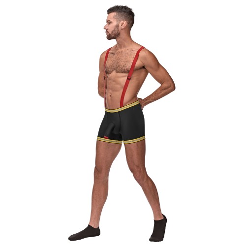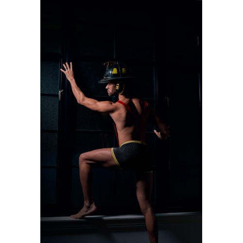 Get your partner hot with the Hose Me Down Costume. This sexy mens firefighter costume features adjustable suspenders and a comfortable open shaft pouch with shimmering trim keeping you the center of attention. Spice up your next role play session with this sultry piece. (Helmet not included).