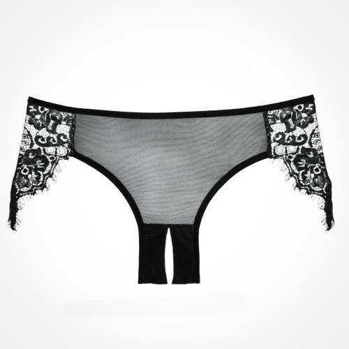 Dreamy crotchless sheer panty with luscious kisses of eyelash lace on the hips.