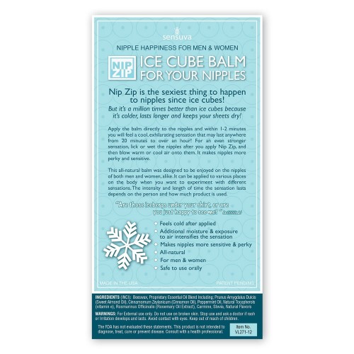 Nipz Zip is the most exciting thing to happen to nipples since ice cubes. This all natural balm was designed to be enjoyed on the nipples of both men and women alike. It can be applied to various places on the body when you want to experiment with different sensations. The intensity and length of the sensation lasts depends on the person and how much