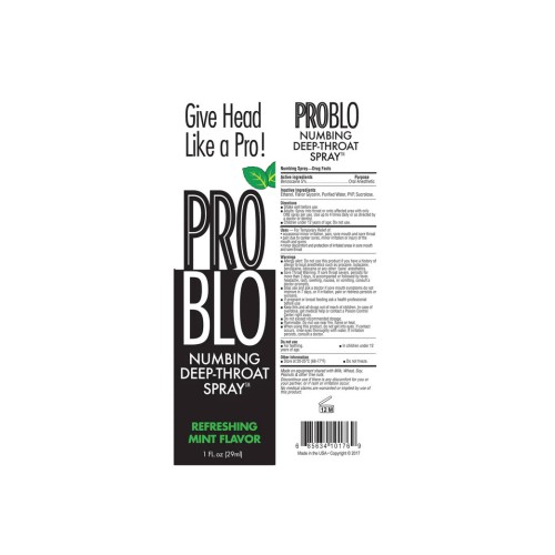 Blow your mans mind with the best oral sex of his life! Just a squirt or two of this numbing spray will allow you to give a better blow job by desensitizing your gag reflex, making it easier to take it longer and deeper than you ever have. Pleasant flavors make you kissable and him gulpable. Use ProBlo for more intense oral play.