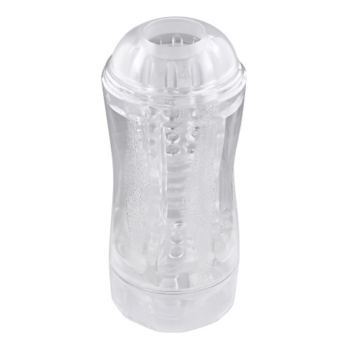 Allow the pleasure possibilities to unfold with this unique dual-ended stroker that's beautifully transparent for an erotic see-through experience. Two separate entries with varying sizes (one tight, one loose) lets you choose your adventure inside the circular beaded chamber that's soft and squishy, yielding yet firm. An included vibrating ring lets you experiment with intense stimulation while you play! The hard plastic exterior canister is textured for an easy grip while caps at both ends ensure safe storage and protection. Sleeve pops out for cleaning.