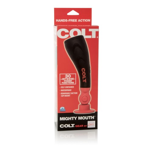 The Colt Mighty Mouth is the 100% waterproof, self-contained power stroker. This vibrating pleasure stroker has a deep throat, noduled chamber for added sensati ons. Featuring 30 incredible functions of vibration, pulsation, and escalation. The memory chip resumes on last function used. The Mighty Mouth has easy push-b utton control and an optional multi-position hands-free suction cup swivel mount , included. Requires 4 AAA batteries, not included.