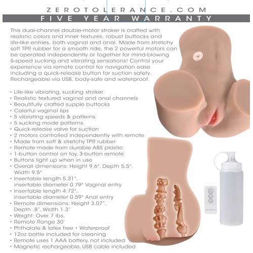 This dual-channel double-motor stroker is crafted with realistic colors and inner textures, robust buttocks and life-like entries, both vaginal and anal. Made from supple smooth silicone for a smooth ride, the 2 powerful motors can be operated independently or together for mind-blowing 5-speed sucking and vibrating sensations! Control your experience via remote control for navigation ease including a quick-release button for suction safety. Rechargeable via USB, body-safe and waterproof.