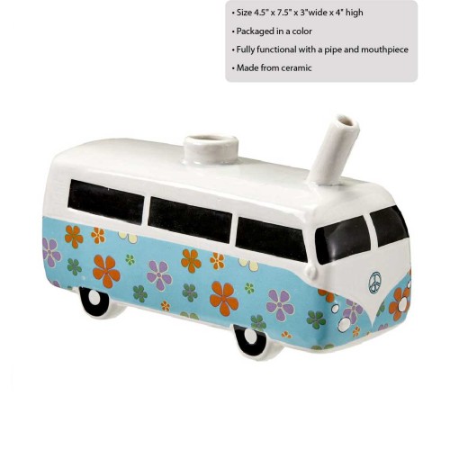 This fun and adorable novelty adult gift item features the shape of a bus with a colorful hippie style flower design on the side. Attached to the top of the bus is a pipe where you can pack your tobacco and light it. The smoke filters up to the mouthpiece at the front of the bus. This ceramic bus is fully functional and comes in a color box - the perfect gift for a trendy friend. This product is recommended for adult use only.