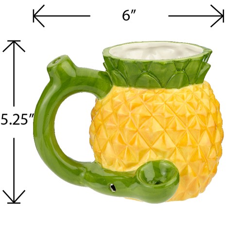 Attached to the front of the mug is a pipe where you can pack your tobacco and light it. The smoke filters up the hollow handle to the mouthpiece on the top, allowing you to enjoy a smoke with your morning or evening coffee. It is microwave and dishwasher safe and comes packaged in a gift box. This product is recommended for adult use only. Get the party started with these fun pineapple mugs when you serve up your coffee and a smoke. Why not offer your guests one to take home as a unique favor?