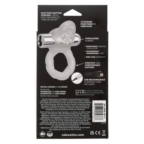 Sized for comfort and intensity Stretchy and comfortable couples enhancer provides sturdy support for him and tantalizing nubbies for her Wireless 3-speed removable stimulator
