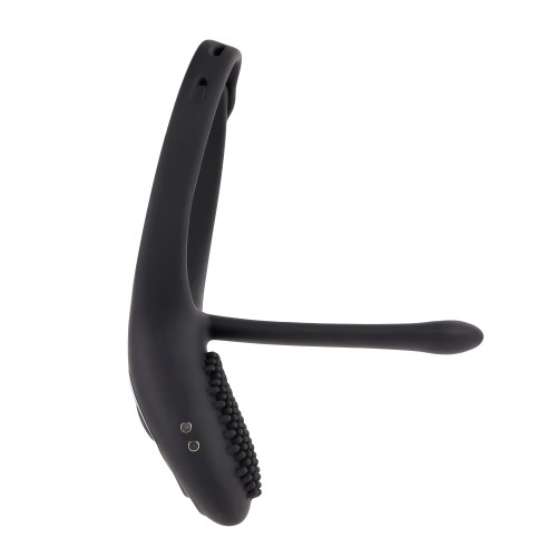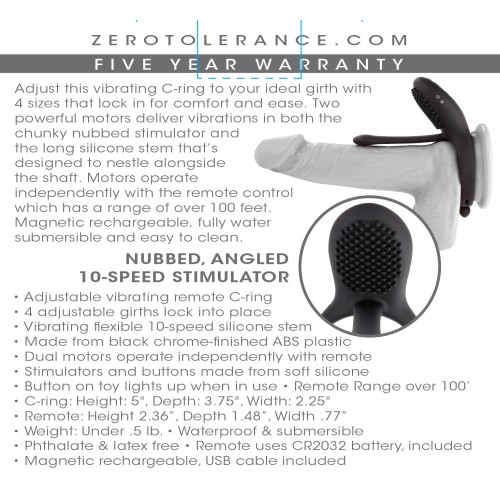 Adjust this vibrating C-ring to your ideal girth with 4 sizes that lock in for comfort and ease. Two powerful motors deliver vibrations in both the chunky nubbed stimulator and the long silicone stem thats designed to nestle alongside the shaft. Motors operate independently with the remote control which has a range of over 100 feet. Magnetic rechargeable, fully water submersible and easy to clean.
