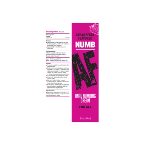 Numb AF will make your anal experience more pleasurable. Numb AF is a strawberry flavored anal-numbing cream. The formulation relaxes the muscles and numbs the nerves for greater comfort during anal play. Safe to use with toys as you build up to the anal experience you desire. Apply a dime size gel to the anal opening and wait 3-5 minutes before engaging in anal play. Reapply as needed. Numb AF helps to take the anxiety out of anal play so you can focus on the pleasure of the experience. Please note that Numb AF is not a lubricant and should be used with your preferred personal lubricant. Each 1.5oz tube comes with a convenient mess-free screw cap.
