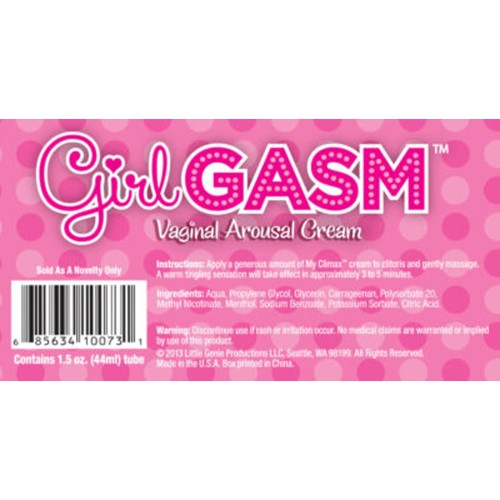Intensify your orgasms with Girlgasm stimulation intensifier. Formulated to enhance feminine sexual pleasure and heighten each orgasm. Enjoy with a partner or during solo play by applying a dime size amount of Girlgasm to the vulva 3-5 minutes before sexual activity. Reapply as needed, and enjoy! Each 1.5 oz tube comes in a convenient tube with a twist-on cap.