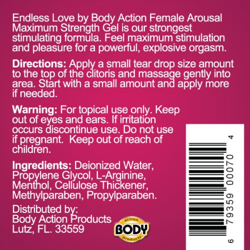 Endless Love Female Arousal Maximum Strength Gel helps is the strongest stimulating formula. Feel maximum stimulation and pleasure for a powerful explosve orgasm.